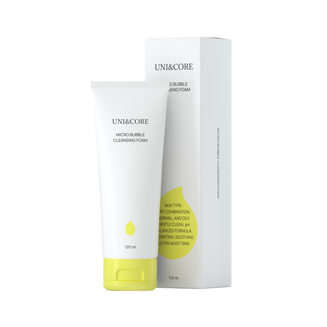 Micro Bubble Cleansing Foam by Uni&Core is a gentle Korean K-beauty facial cleanser that uses fine micro bubbles to lift impurities, excess oil, and makeup while maintaining skin comfort. The soft foam texture cleanses thoroughly without leaving skin tight or dry.